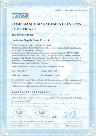 Unifortune Supply Chain Co., Ltd,established in 2010 at Shenzhen City Guangdong Province China, is a leading international supply chain management service provider. The company has grown over the years to achieve a paid-in capital of 720 million yuan, an annual business scale exceeding 40 billion yuan, and a customer base of over 6,000 clients. Unifortune has received widespread recognition from all sectors of society and has been awarded more than 70 honors and qualifications from national and provincial levels , including but not limit to below: